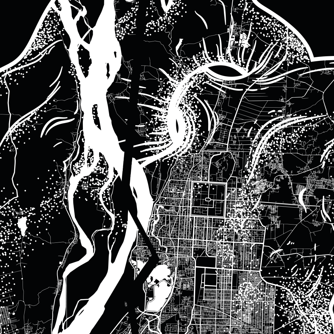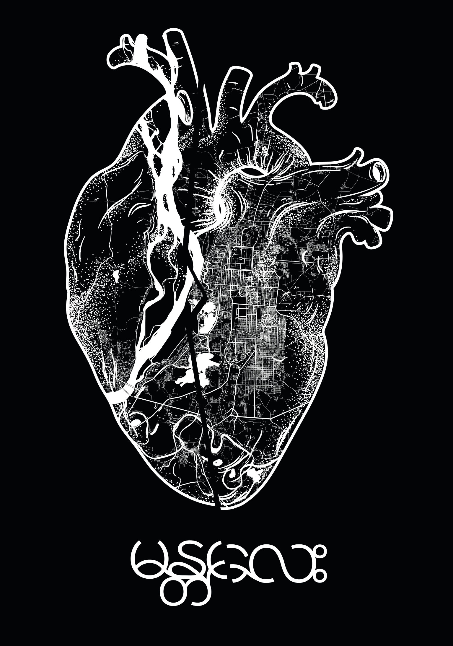 A raw, emotional cartographic print featuring the streets of Mandalay and Sagaing etched into the shape of a real human heart — not the simple icon, but the true, complex form. It symbolizes how Mandalay lives in the heart, and how the pain felt before the earthquake has deepened into something that now feels irreparable.